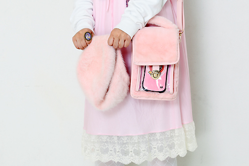 「冬と言う事もあって“もこもこ”を意識しました。バッグはお気に入りのBUBBLESで買ったんですが、触り心地が最高なんですよ〜! バッグからチラっと見えてる携帯ケースもピンク色です♡」