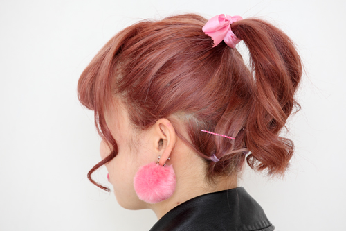 アクセサリーはピンク色でコーディネートしました。ボリュームのあるイヤリングもカワイイでしょ? 実はヘアピンもピンクなんです! 髪色がピンク色なのは偶然ですけど、今日のコーデに合わせた感じになりました(笑)
