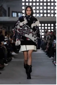 定番のウールブレザーには、身体に巻きつけたり片方の肩にかけたりと、
