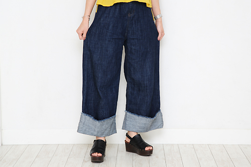 「『w closet』で買ったワイドパンツは、Aラインのシルエットで脚長効果があるんですよ〜! ロールアップされているので、足元にもポイントを作れるところが気に入ってます。足首がチラッと見える丈なので、厚底サンダルを合わせて肌を見せ、涼しさも演出してみました」