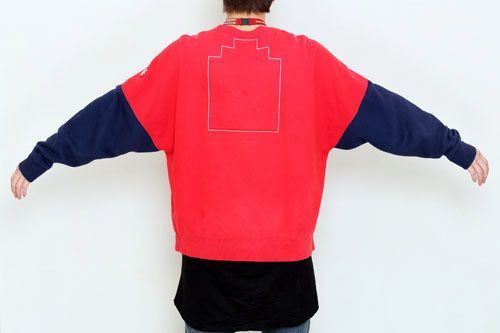 “上半身は大きめで下はタイト”というバランスが、いつもの僕のスタイルです。今日は赤のトップスをメインに、長めのロンTの裾を出してポイントに。このスニーカーは憧れの先輩からもらって愛用しています☆