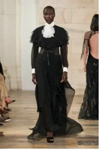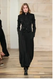 フリルのついた白いシャツとパンツの組合せは、ダンディズムの新しい形を提示し、