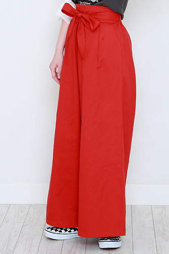 「この袴風パンツを穿きたかったんです! とにかくインパクトがある濃いレッドなので、ほかのアイテムは暗めのカラーを選んでバランスをとりました」