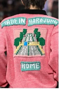 携帯ゲーム機などをモチーフに取り入れたニット。柔らかな色味でまとめ、