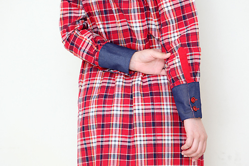このワンピースのポイントはカフスが大きめなところ! 課題の条件が布を3種類使うことだったので、赤チェックをメインに、カフスには思い切って好きなデニム生地を使いました。ちなみに、前立てにはチェックと色味が近いものをチョイスしました