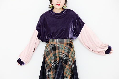 「上着の下もとことんカラフルに! トップスは二の腕部がドレープになっていてカワイイでしょ? 色も途中でピンクに変わっているので、この服1枚で2色を取り入れられるから気に入ってるんです」