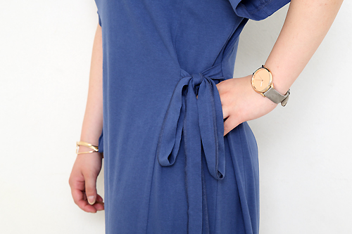ワンピースのサイドについているリボンは、気分やコーデによって前で結んだり後ろで結んだりできるから、このワンピ1枚で3通りの着方ができるんだって! プレゼントでもらった時計に合わせて、アクセは全てゴールドで統一しました。