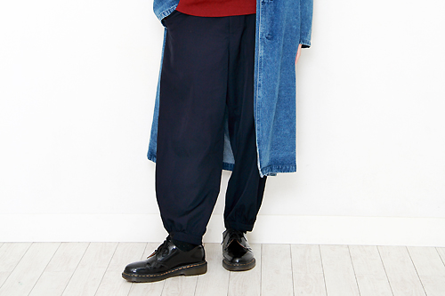 「サルエルパンツは、ゆったりとしたシルエットで楽に着れるから好きですね。今日は、かなり前から大事に履いてるDr.Martensを履いてきたんです。パンツが足首できゅっと締まっているので、靴もしっかり見せることがでるんですよ」