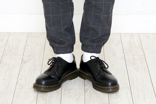 裾が絞ってあるウールのズボンはファストファッションショップで買いました。コーディネートの中に、どこか一点お手軽なアイテムを入れてバランスをとっています。