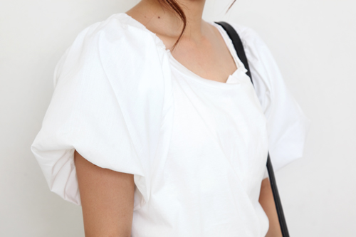 「ボトムスが柄モノなので、相性を考えて白にしてみました。バルーンのような袖で、女の子らしさをアップ! 腕や手首のラインも華奢に見えるアイテムなので、バランスも取りやすいんです。トップスにボリュームを出して、全体的に甘めな雰囲気を目指しました」