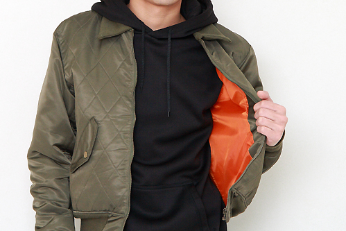 「服飾造形」の授業で作った、キルティング生地を使った手作りMA-1。裏地は定番のオレンジです。本来は、レスキューの意味があるカラーですが、チラッと色が見えるのもオシャレですよね。差し色にもなるので、大活躍のアイテムです。