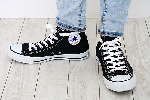 お気に入りのCONVERSEのハイカットスニーカー。足首のところに紐を巻き付けるスタイルは、オシャレさんならぜひ覚えておきたいスタイル。簡単にできるのでぜひみなさんもチャレンジしてみてね!