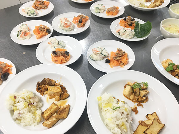 豆腐としいたけのチリソース、プルーン入りのキャロットサラダ、