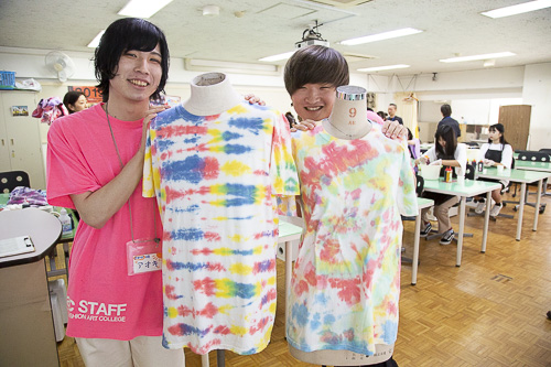 なんと!前回、体験入学で作ったタイダイTシャツを着て