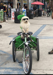 大道芸人やワンちゃんに釘付けの学生たち。