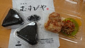 お持ち帰り用のおむすびセット(おむすび2個、唐揚げ、お惣菜)を頼んでみました!