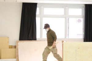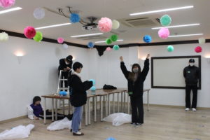 今日は教室の飾り付けや壁紙はりを行なっているとこを