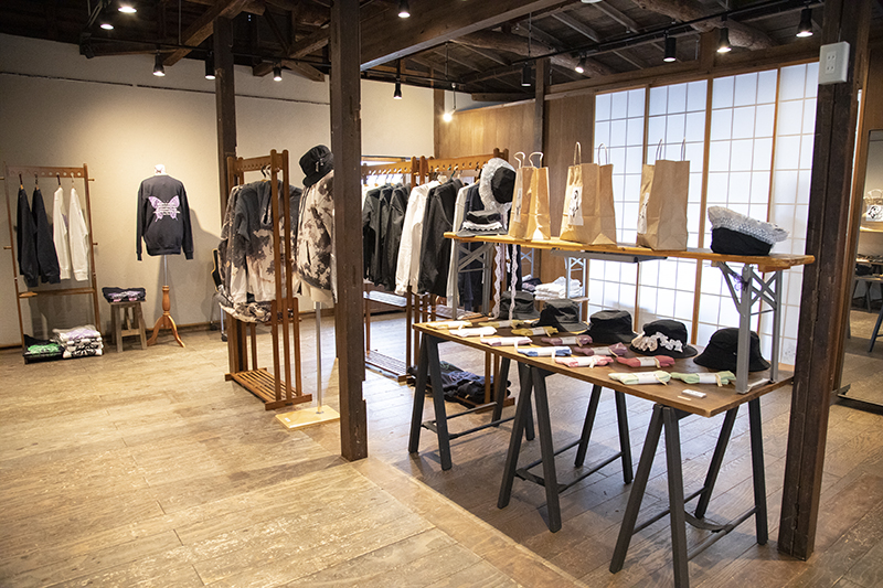 パーカー、靴下、帽子、カバンなど商品が沢山並んでいます。