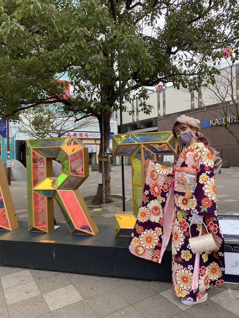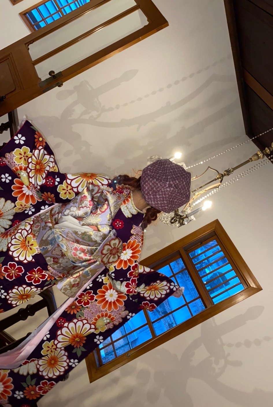 手作りの帽子とマスクが振袖とあっててバッチリです💘