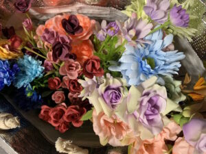 写真の造花やリボン、ビーズ等々…いろいろなパーツで