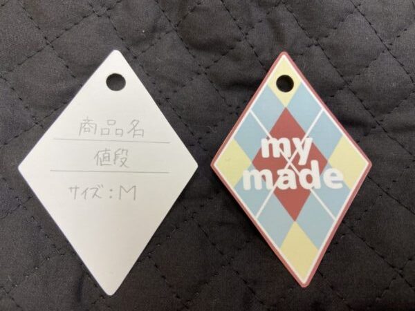ショップ名のmymadeのようにシンボルマークを使い表記は手書きにし、オリジナルのタグを作りました🏷