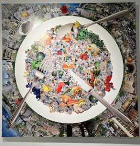 ↑チラシや新聞などから切り抜いたものをコラージュした作品。