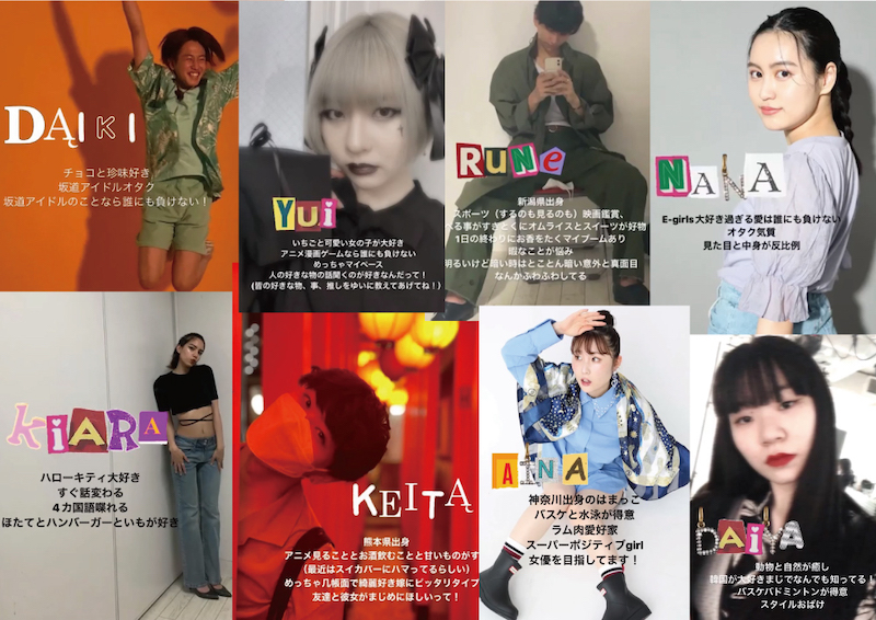 緑:Keita 水色:Daiki 黄色:Rune グレー:Nana オレンジ:Yui ピンク:Aina 紫:Daiya