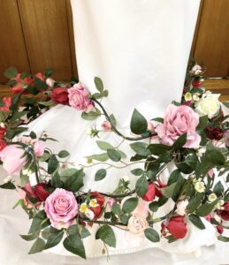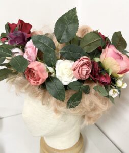 オレンジベージュのウィッグを巻いて可愛くした上に花かんむり♪