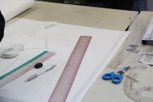 カメラの使い方を教わった後は、2年アパレル造形科 デザイナー・パタンナーコース「服飾造形実習」の授業にお邪魔して、衣装制作の様子を取材しました。