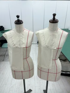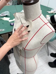一方で、ドレーピングはデザイン画を元に、作りたい形をボディの上で直接作ります。