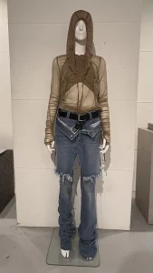 ↑シアー素材のレイヤードトップスに、デニムパンツがショートとロングでレイヤードされたパンツ!
