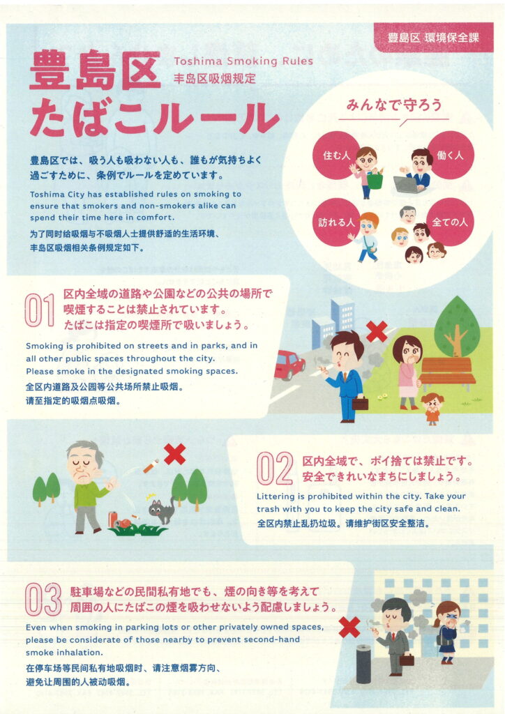 区内全域、公共の場所での喫煙やたばこのポイ捨ては条例で禁止されています。
