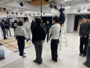 舞台管理チームは脚立に乗って舞台制作を進めていました!