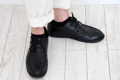 「あまり固くなりすぎないように、パンツはロールアップにして、少し遊び心も入れてみました。足首を見せることでカジュアルな雰囲気も出るし、脚長効果もあるんですよ♪ 普段革靴はあまりはかないので、なんだか新鮮な気分です!」