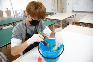 先輩たちと相談しながら、どんな色に染めるか作業を進めてゆきます...