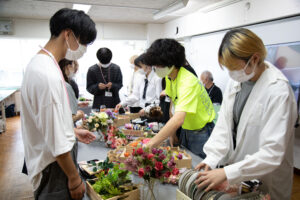 テーブルに並べられた様々なお花やぬいぐるみを元に、好きなアレンジで作業開始!