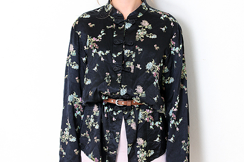 古着屋で見つけたチャイナ風のブラウスがポイント。全体的にダラっとしてしまうので、ベルトで引き締めました。ペチコートをスカート代わりにするのは、トライしてみたかったテクニックなんです!