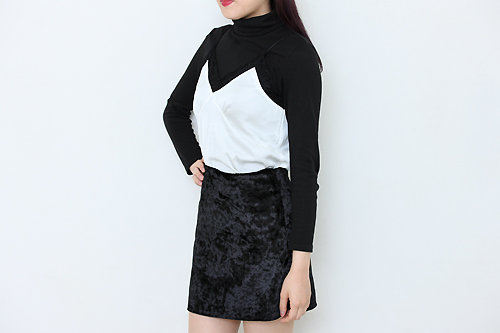 「全身黒だと少し重くなりすぎるかなと思って、白のサテンのビスチェを合わせてみました。同じ黒でも、トップスはニット、スカーロはベロアなど素材の違うものを使って、単調になりすぎないコーデにするように心がけています」