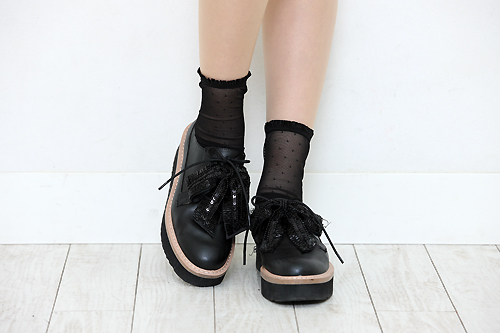 靴は革、靴下はシースルー、靴ひもはラメ…と足元も黒で統一しながらも、全く違う素材を組み合わせています。茶色のラインがあることで真っ黒にならず、少し軽さがでて、バランスの良いコーディネートになっています!