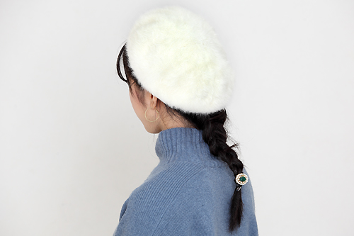 「もふもふのベレー帽はAZULでGET♪ 顔周りがもこもこしているので、ヘアスタイルはすっきりしたものにしたくて編み込みに。サイドの髪を出すのが好きではなくて……。でも、それだと少し寂しすぎるかなって思ったので、大きめのリングピアスをつけました☆」