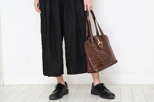 暑くなってきたので、涼しく着れるガウチョパンツをチョイス。同じ色味の革靴を合わせました♪ バッグはアウターと同じ柄物に。アイテムのバランス感が良く、統一感のあるコーディネートになっていますね!