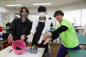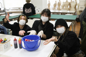 先輩たちと相談しながら、どんな色に染めるか作業を進めてゆきます...