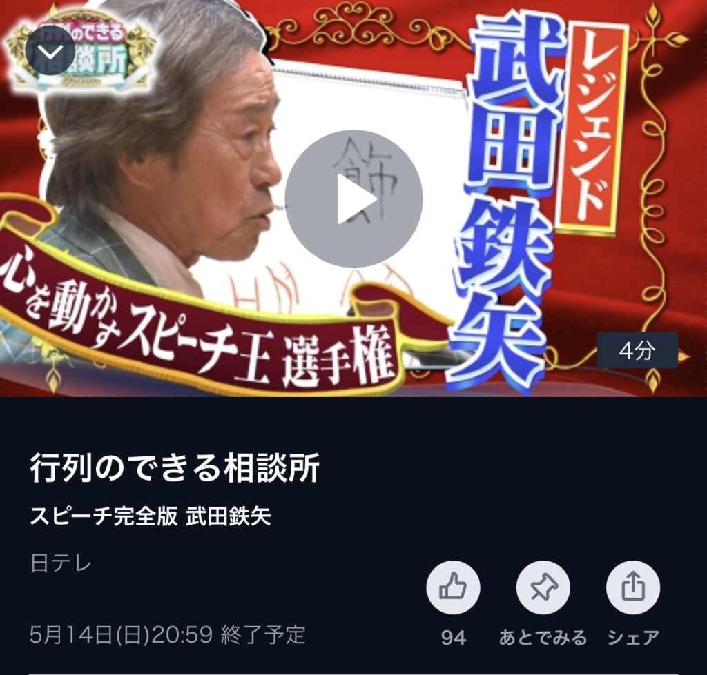 なんとTVerでは、武田さんスピーチ完全版が5月14日20:59までは無料で