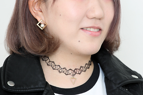 「シンプルな顔周りにはアクセサリーをプラス! シリコン素材のチョーカーは、柔らかくてつけている感覚があまりなく、ストレスフリーなのでオススメです♡ シンプルなTATOOチョーカーと、このピアスはどんなファッションにも合うので大活躍しています」
