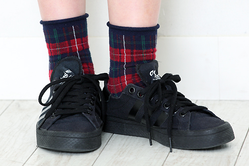 モノトーンなコーディネートに赤チェックのソックスを合わせて、差し色に。黒×赤はやっぱり定番の組み合わせですよね☆メイクやネイルも赤系で揃えて統一感を出しています! 暗い色味になりがちな冬のファッションにこそ、明るいカラーを上げたいですね♪