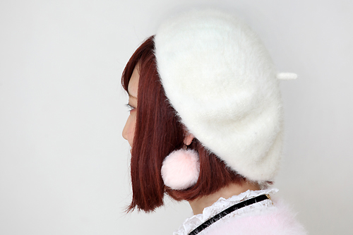 今季も流行中のベレー帽は、白をチョイスして甘い雰囲気をアップ! ニットとのコンビネーションが抜群なふわふわピアスは、お友達からのプレゼントなんですって☆ 女子力高めのアイテム選びは参考になります♪