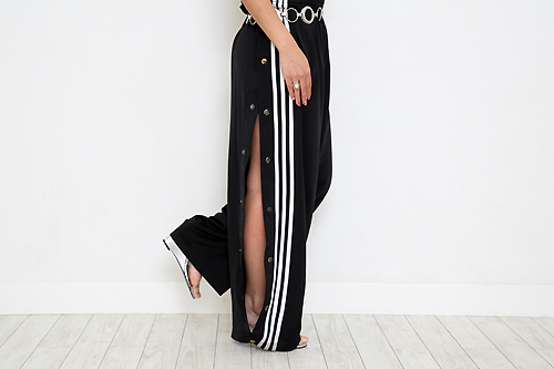 「サイドも肌見せは忘れません! 普通に穿くだけじゃやっぱりつまらないから、ボタンはしてないんです。一番下だけは、歩きにくいからと思って留めたけど、こっちの方が前から見た時のシルエットが綺麗になったので、一石二鳥です☆」