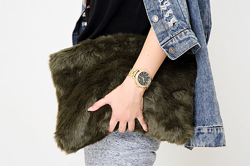 買ったばかりのファークラッチバッグは、最近気になっているカーキ色です。スワロフスキーが散りばめられたこの時計も大好きで、ちょっとラグジュアリーな感じになると思いませんか?