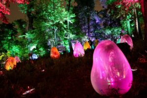 夜の「チームラボ どんぐりの森の呼応する生命」の
