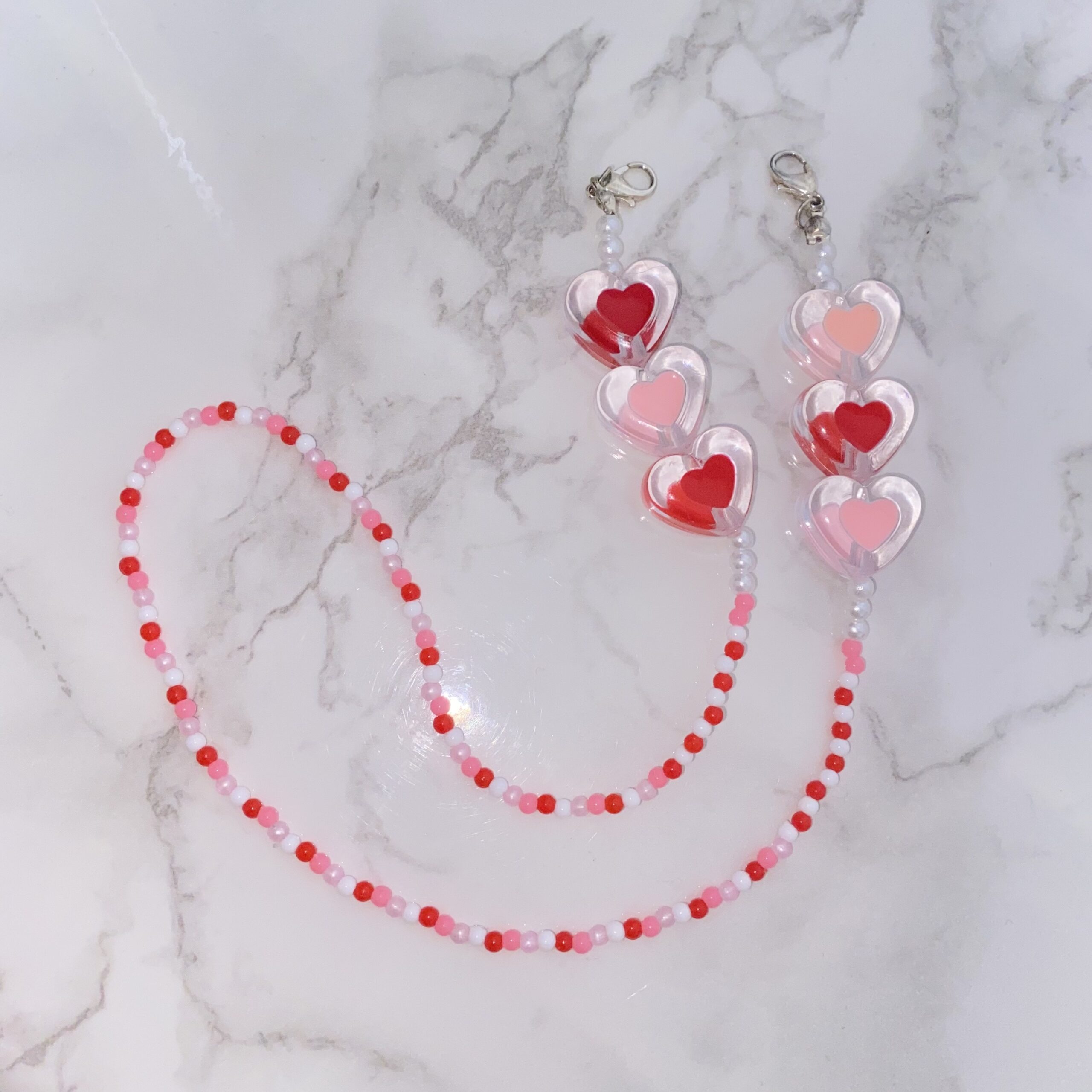 後ろはハートの赤とピンクに合わせて小さなビーズを並べました。